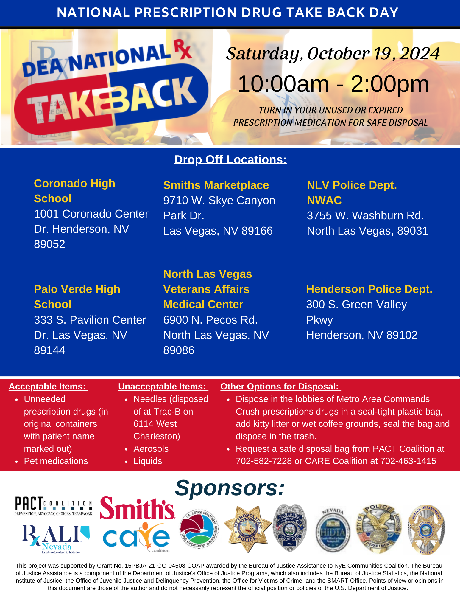 2 days out of ever year Nevada holds “Pill Take Back Day’s” where people from the community can drop off and dispose of their pills or syringes