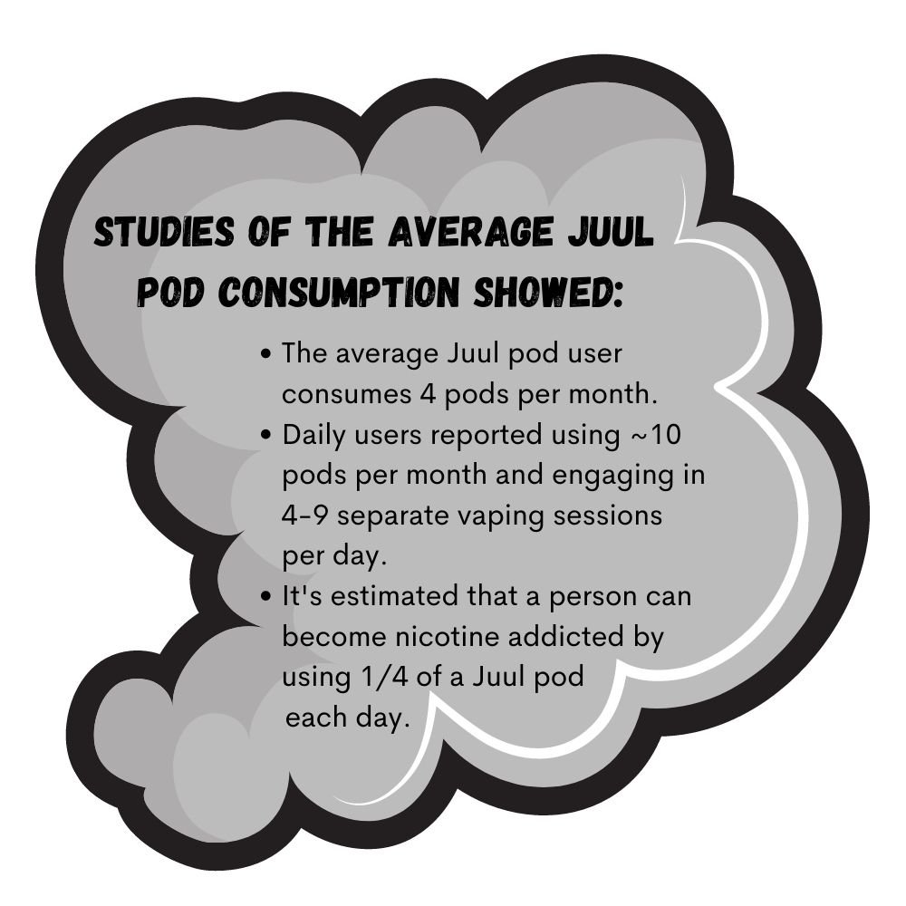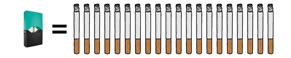 Juul has a high level of nicotine, which is twice the amount of nicotine concentrate as many other brands of e-cigarettes. According to the manufacturer, a single Juul pod is equivalent to a pack of 20 regular cigarettes.