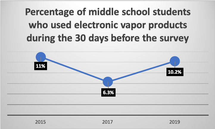 In Clark County, 10.2% of middle school students who used electronic vapor products during the 30 days before the survey. This is a 3.9% increase since 2015.