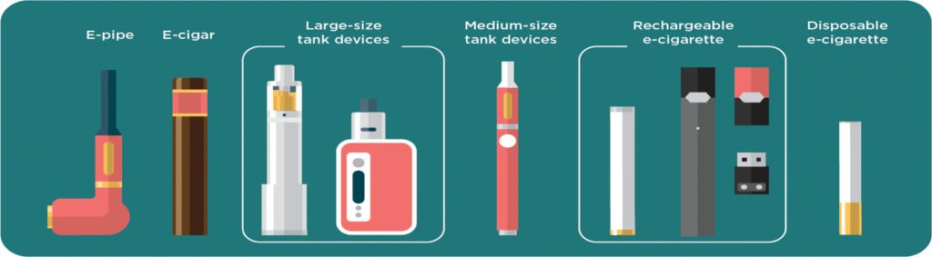 Electronic cigarettes (E-cigarettes) are known by many different names, such as “e-cigs,” “e-hookahs,” “mods,” “vape pens,” “vapes,” “tank systems,” and “electronic nicotine delivery systems (ENDS)”. They come in many shapes and sizes, such as the look of a regular cigarette, cigars, pipes, USB flash drives, pens, and other everyday items. They all produce an aerosol by heating a liquid that usually contains nicotine and other chemicals that help to make the aerosol. Using an e-cigarette is sometimes called “vaping” or “Juuling.”