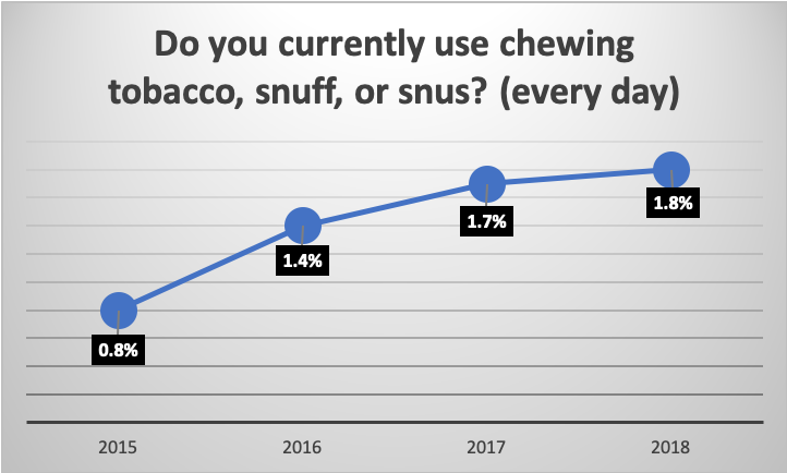 In 2018, 1.8 % Nevadans reported they currently use chewing tobacco, snuff, or snus (every day). This system shows us a growing increase since 2015.