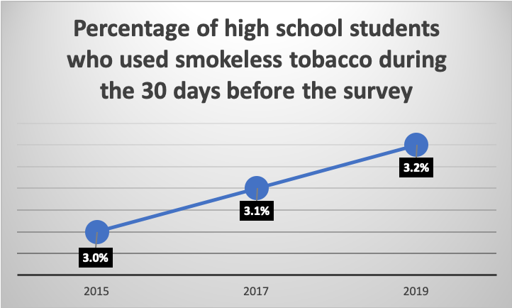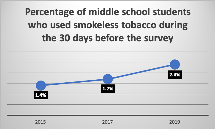 In Clark County, 2.4% of middle school students reported they have used smokeless tobacco during the past 30 days before the survey. Although the percentages are small, this shows a 0.7% increase since 2017, and has been slowly increasing since 2015.