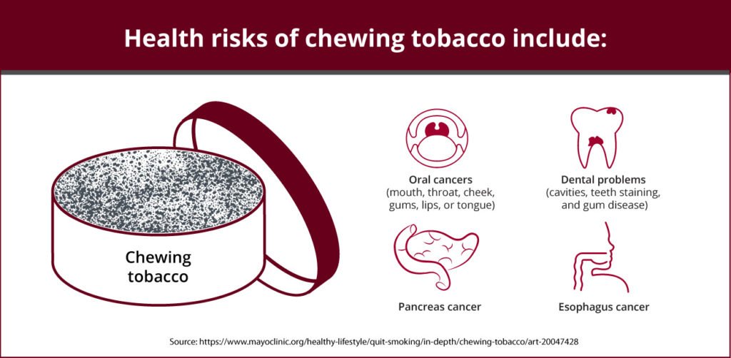 Smokeless tobacco is better known as spit tobacco, chewing tobacco, chew, and dip. Users put tobacco leaves into their mouth and suck on them instead of smoking them in cigarettes. Chewing tobacco is larger-grain tobacco leaves that are twisted or shredded and come loose in paper packets or small cans.