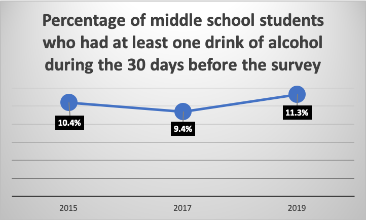 In Clark County, 11.3% of middle school students reported they have had at least one drink of alcohol during the 30 days before the survey. This is a 1.9% increase since 2017.